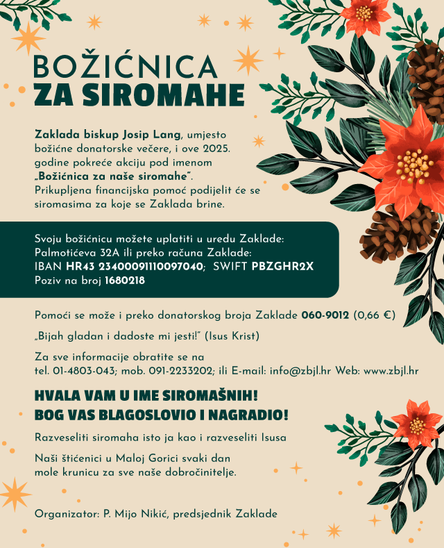 ZAKLADA BISKUP JOSIP LANG ORGANIZIRA HUMANITARNI KONCERT DUHOVNIH I DOMOLJUBNIH PJESAMA STIJEPO GLEĐ MARKOS Crkva Bezgrješnog Srca Marijina, Jordanovac 110, Zagreb Petak, 21. 11. 2025. u 20.00 sati Moderator programa: p. Mijo Nikić Dobrovoljni prilog s ovog koncerta ide u fond za pomoć siromašnim i nemoćnim osobama za koje se